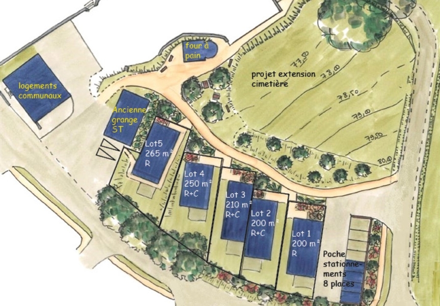 Un projet de lotissement d’habitations individuelles dense : proposition de 5 lots de 200 à 265 m² de surface avec enclave de stationnement collectif en entrée de site. Un projet qui s’inscrit dans un contexte patrimonial très qualitatif avec un cône de vue sur le clocher à préserver.