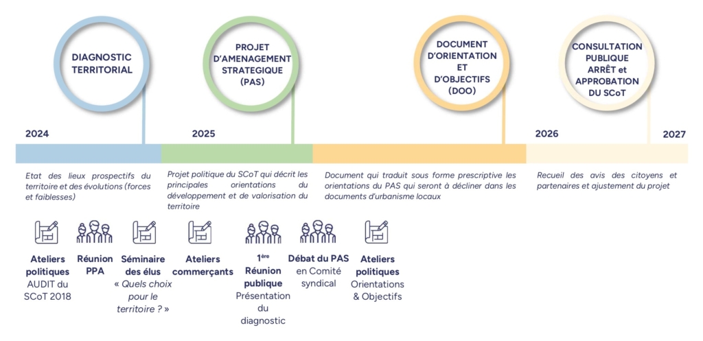- 2024 : La réalisation d’un audit stratégique du SCoT en vigueur au regard des évolutions récentes pour définir une feuille de route précise pour la révision : quels sont les orientations et objectifs à maintenir ? à actualiser ? à ajouter ?