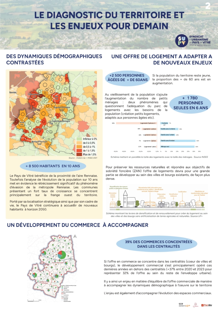 - Le territoire doit se préparer à l’accueil de plus en plus de personnes seules et âgées, et répondre à l’évolution des modes de vie, des modes de consommation et des pratiques de mobilités. Des transformations démographiques et sociologiques viennent et vont inévitablement interroger la manière d’habiter et d’aménager le territoire, enjeux auxquels le Pays de Vitré va devoir répondre.